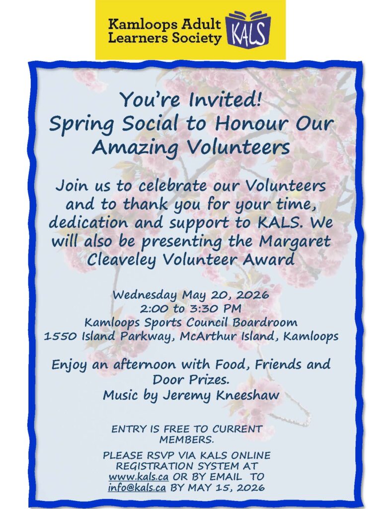 KALS Invites you to the KALS Volunteer Appreciation Social and Presentation of the Margaret Cleaveley Award. Wednesday May 20, 2026, 2pm – 3:30pm, Kamloops Sports Council, 1550 Island Parkway Drive,…